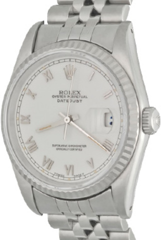 Stainless Steel case with 18k White Gold fluted bezel (36mm dia.)