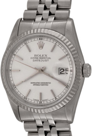 Stainless Steel case with 18k White Gold fluted bezel (36mm dia.)